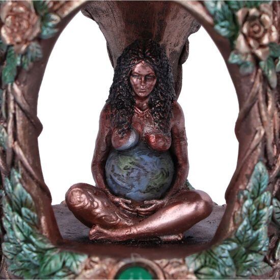 綺麗な花々と、緑の葉、輝くエメラルド色のカラーストーンで飾られたアーチの下に静かに座っている偉大なる地母神、母なる地球の女神はその腕に我が子を抱くように地球を抱えています。